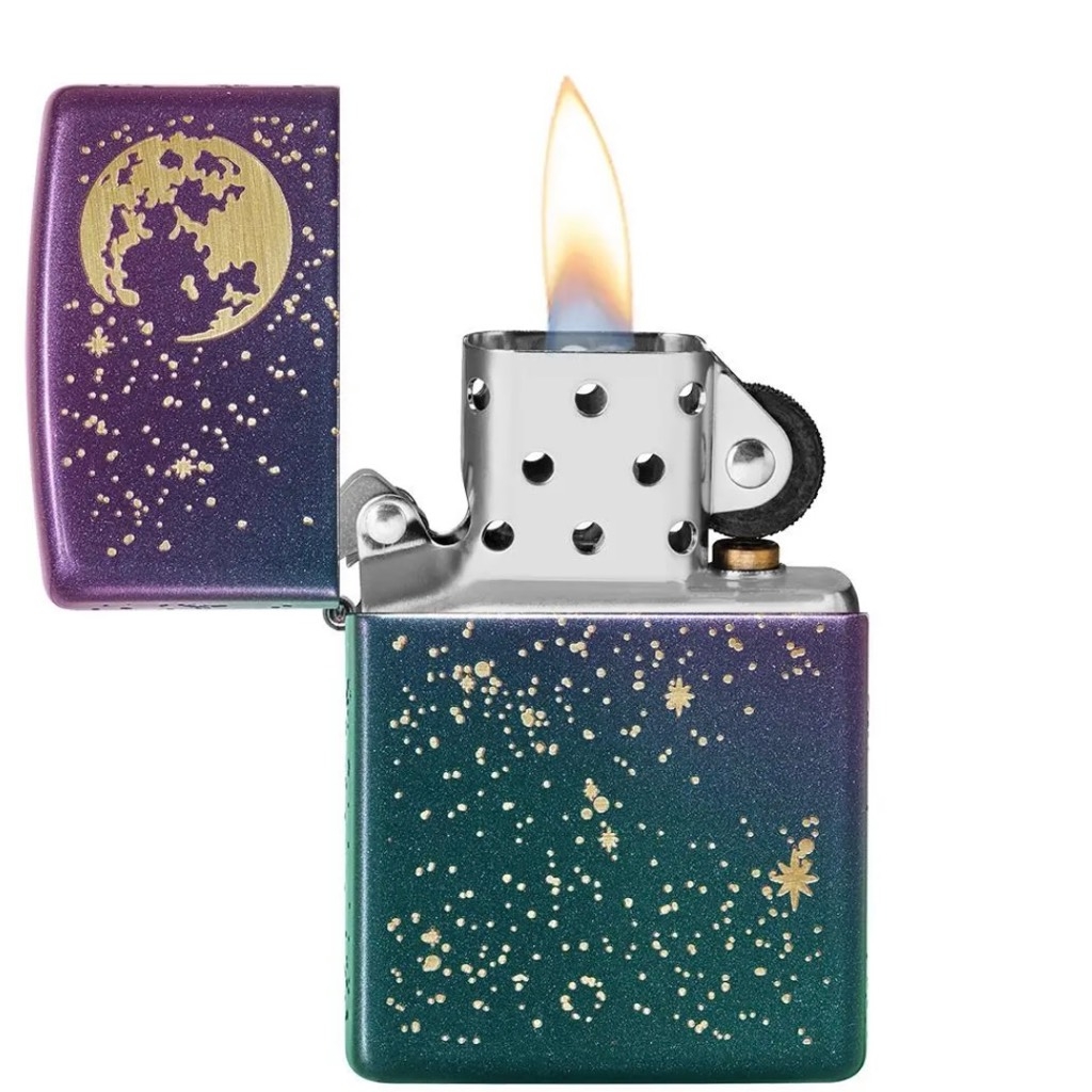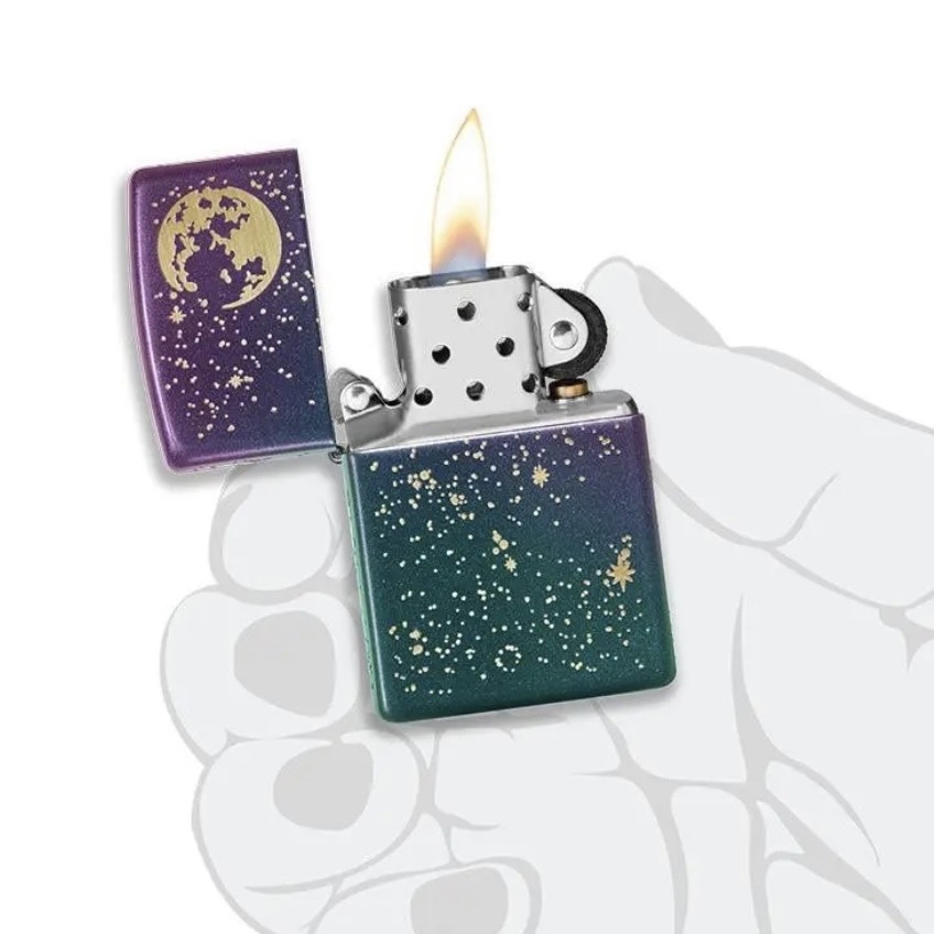 Ngắm nhìn bầu trời đêm lung linh của chiếc bật lửa Zippo ánh kim . Thiết kế Starry Sky sử dụng phương pháp khắc laser để tạo ra những ngôi sao lấp lánh trên bốn mặt tuyệt đẹp.